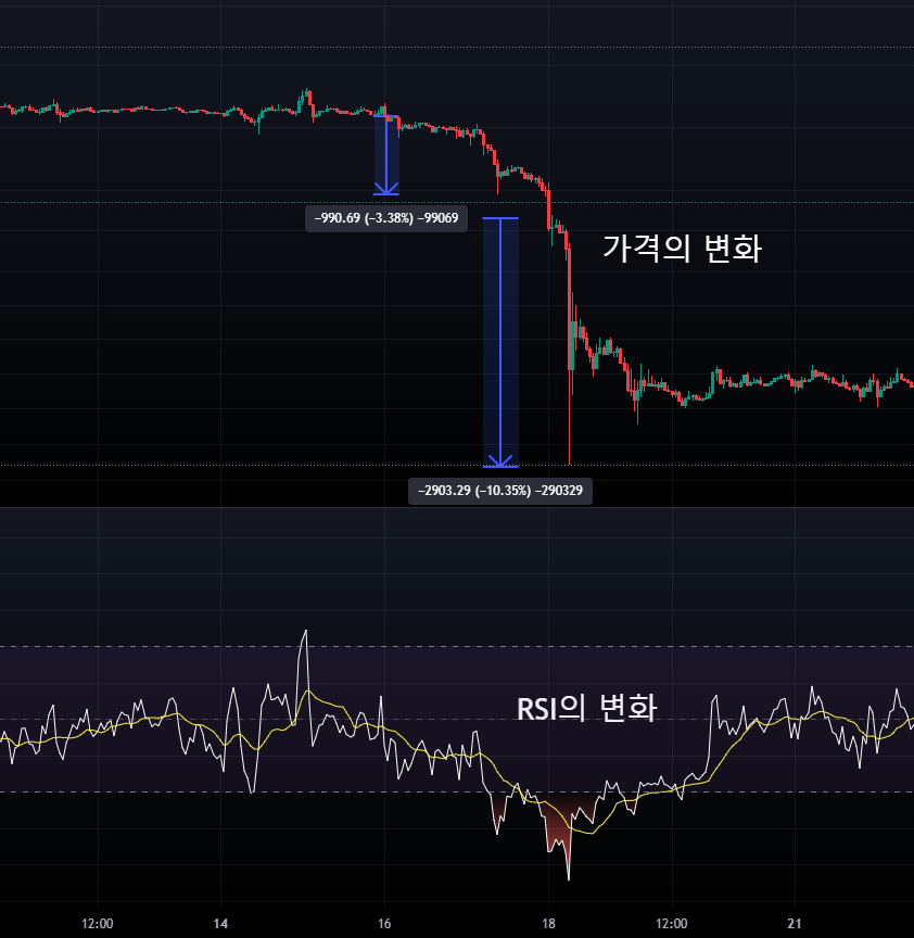 다이버전스가 발생된 구간은 보통 RSI가 얼마나 떨어지거나 올랐는지,