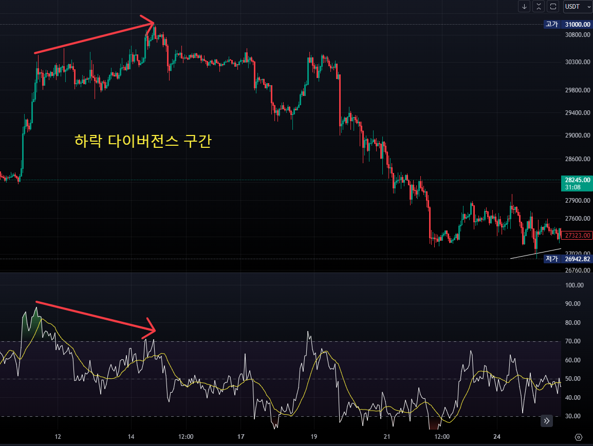 가격은 올라갔지만, RSI는 떨어진게 보이시죠?