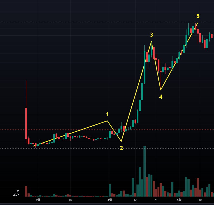 5파동에서 더 큰 호재로 인해 거래량이 3파동 만큼 나올때라면 더 큰 상승이 나올 가능성이 있다는 내용이죠.
