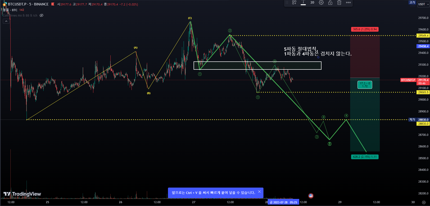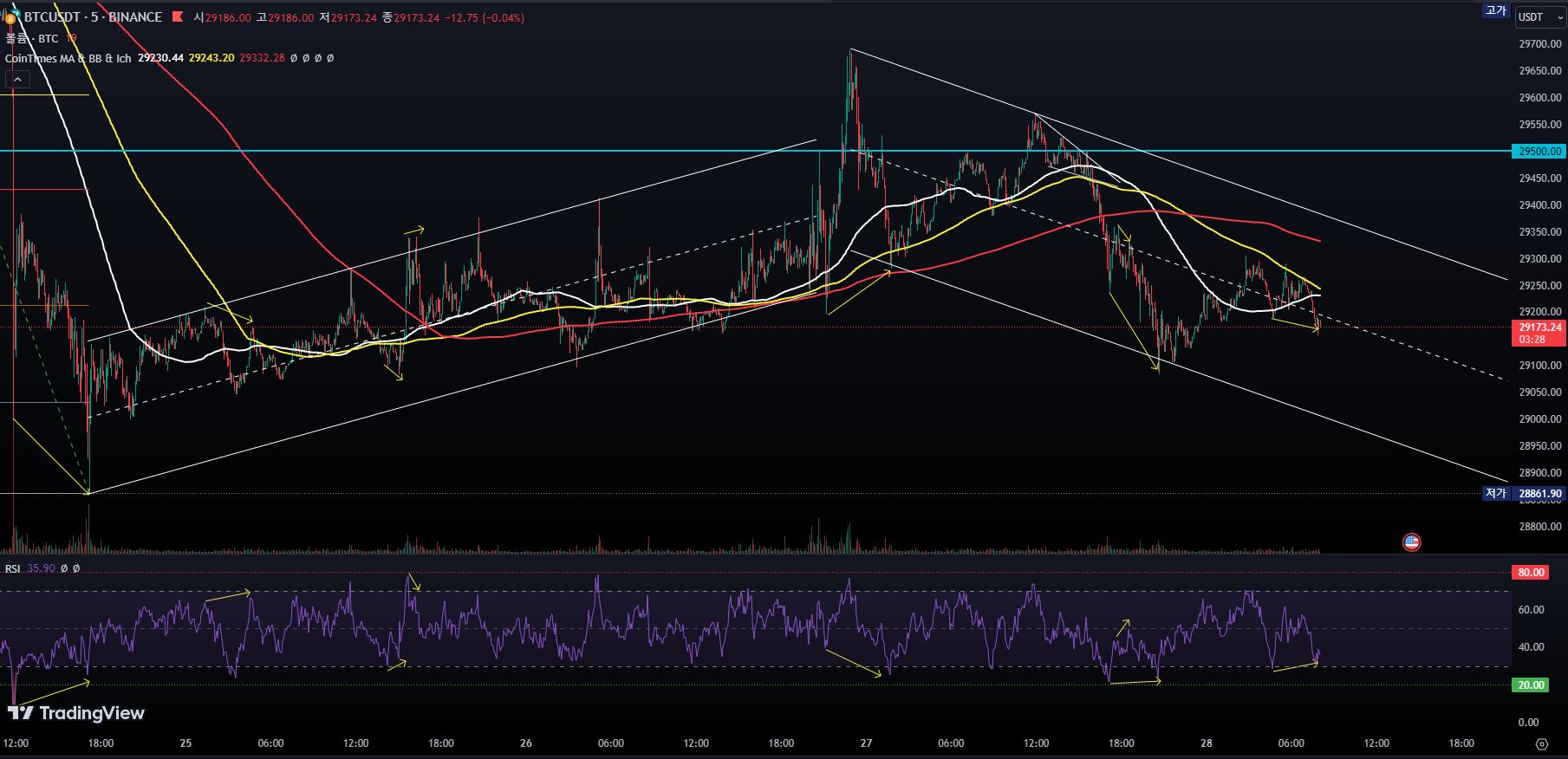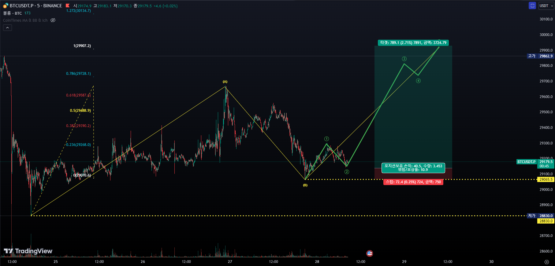 매매의 관점에서 본다면 현재 숏 포지션을 들어가면 손절이 2파의 저점인 29.5K정도 되는데,