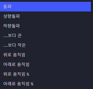 상향 돌파나 하향 돌파를 많이 사용하고 있습니다.