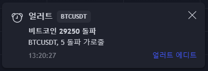 가격이 돌파했을때 얼러트로 비트코인 29250 돌파로 알람이 뜨면 차트 확인하시고 매매를 계속하시면 됩니다.