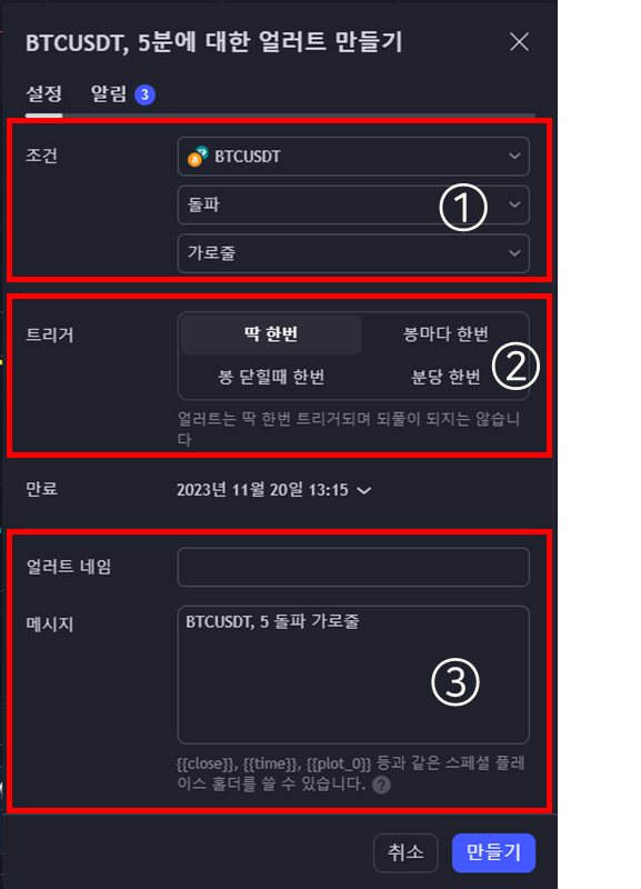 ① 조건 부분에서는 어떤 상황에서 알람이 울리길 설정할 수 있습니다.