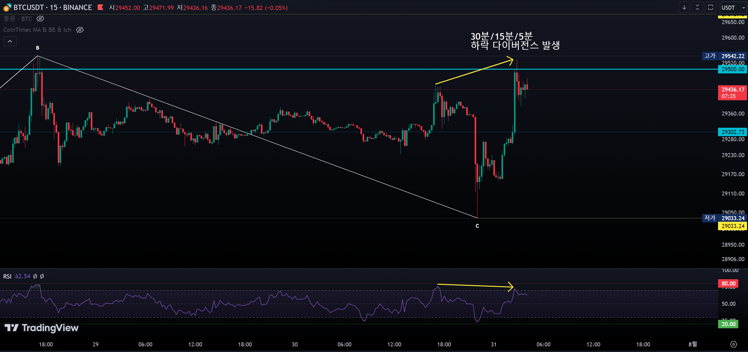 B파동의 저점끼리 4시간봉 이하에서 상승 다이버전스(이하 '상다') 발생으로 상승중이라고 생각합니다