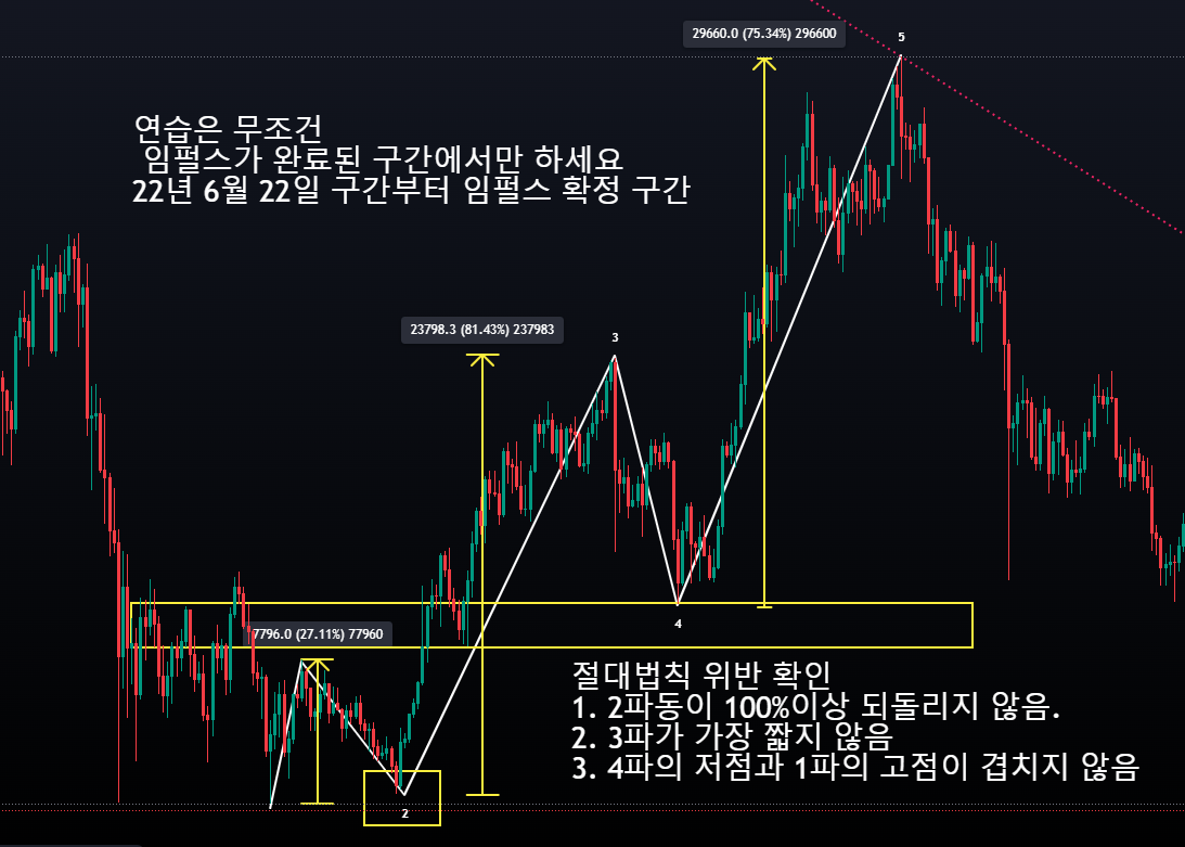 막상 차트에 임펄스 12345를 카운팅하시면 절대법칙 때문에 카운팅이 어려운 경우, 혹은 아 이건 잘못된 카운팅이구나...